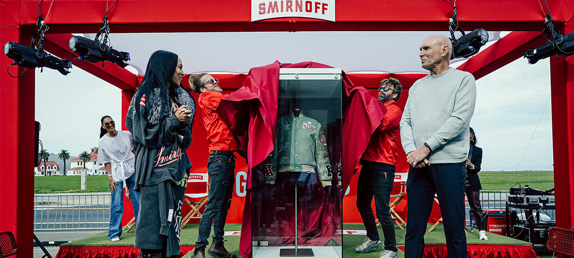 Unveiling an Aleali May jacket, the limited-edition release marked Smirnoff’s first merchandise giveaway with the NFL, as the league’s official vodka sponsor. Consumers had the chance to see the mobile fashion showcase and win a varsity jacket and trip to the Super LX, presented by May on a Smirnoff trolly.